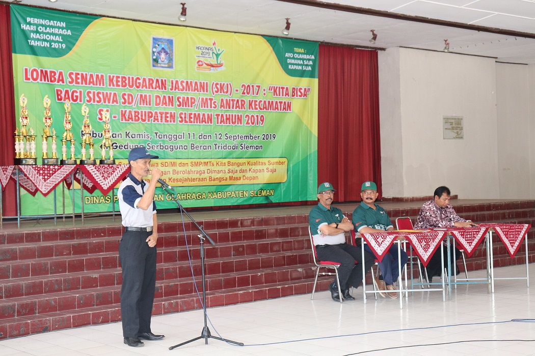 Sleman – Dalam rangka pembinaan dan peningkatan kesegaran, kebugaran dan kesehatan, serta penanaman nilai-nilai karakter keolahragaan siswa (peserta didik), sekaligus menyemarakkan peringatan Hari Olahraga Nasional tahun 2019 dengan tema “Ayo Olahraga Dimana Saja, Kapan Saja”, Dinas Pemuda dan Olahraga Kabupaten Sleman bekerjasama dengan Dinas Pendidikan menyelenggarakan kegiatan lomba Senam Kebugaran Jasmani (SKJ)-2017 “Kita Bisa” bagi siswa SD/MI dan SMP/MTs antar Kecamatan se-Kabupaten Sleman tahun 2019 pada hari Rabu dan Kamis tanggal 11 dan 12 September 2019 bertempat di Gedung Serbaguna, Beran, Tridadi, Sleman.