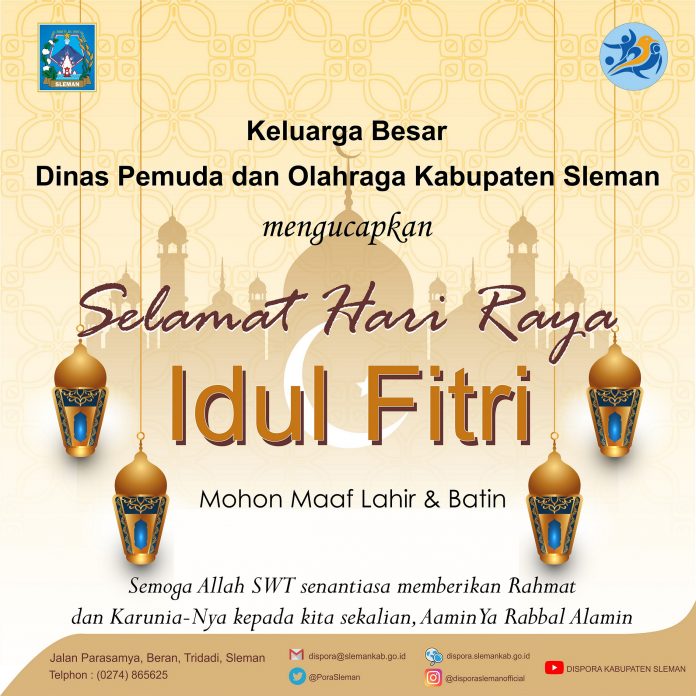 serba-serbi Selamat Hari Raya Idul Fitri Penulis dispora - 21 April 2023 0 155 Keluarga Besar Dinas Pemuda dan Olahraga Kabupaten Sleman mengucapkan Selamat Hari Raya Idul Fitri, mohon maaf lahir dan batin, semoga Allah SWT senantiasa memberikan Rahmat dan karunia-Nya kepada kita sekalian. Aamin Ya Rabbal Alamin.