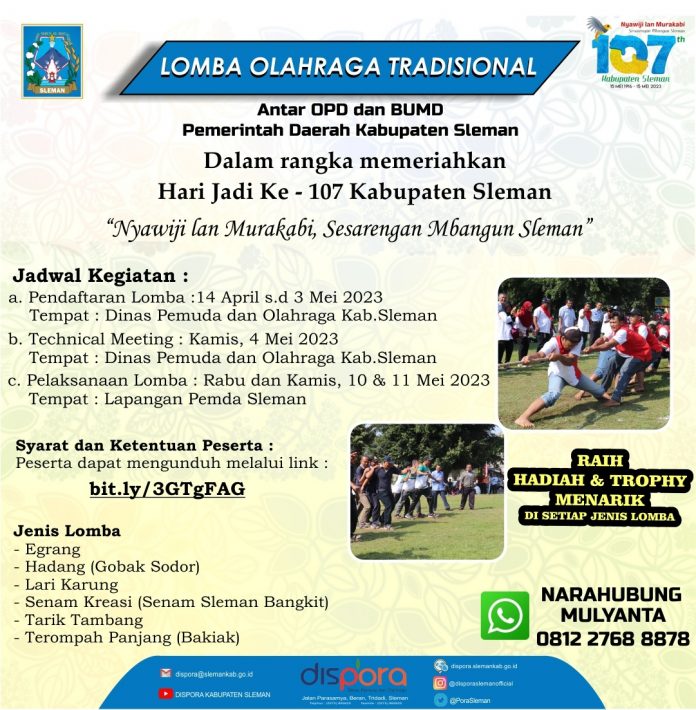 Dalam rangka memeriahkan hari Jadi Kabupaten Sleman yang ke 107, Dinas Pemuda dan Olahraga Kabupaten Sleman akan menyelenggarakan Lomba Olahraga Tradisional antar OPD dan BUMD Se-Kabupaten Sleman.