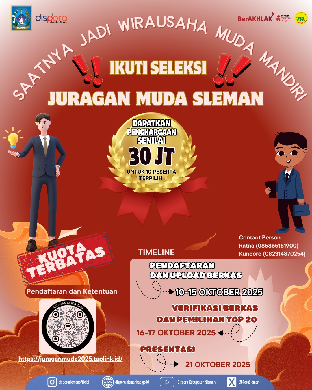 Pengumuman Juragan Muda Kabupaten Sleman 2025 Penulis dispora - 9 Oktober 2025 0 114 JURAGAN MUDA KABUPATEN SLEMAN TAHUN 2025 Hai sobat pora,Kamu punya usaha? Ayo ikuti Seleksi Juragan Muda Tahun 2025 SEGERA DAFTARKAN USAHAMU SOBAT KUOTA TERBATAS Syarat dan Link Pendaftaran: https://juraganmuda2025.taplink.id