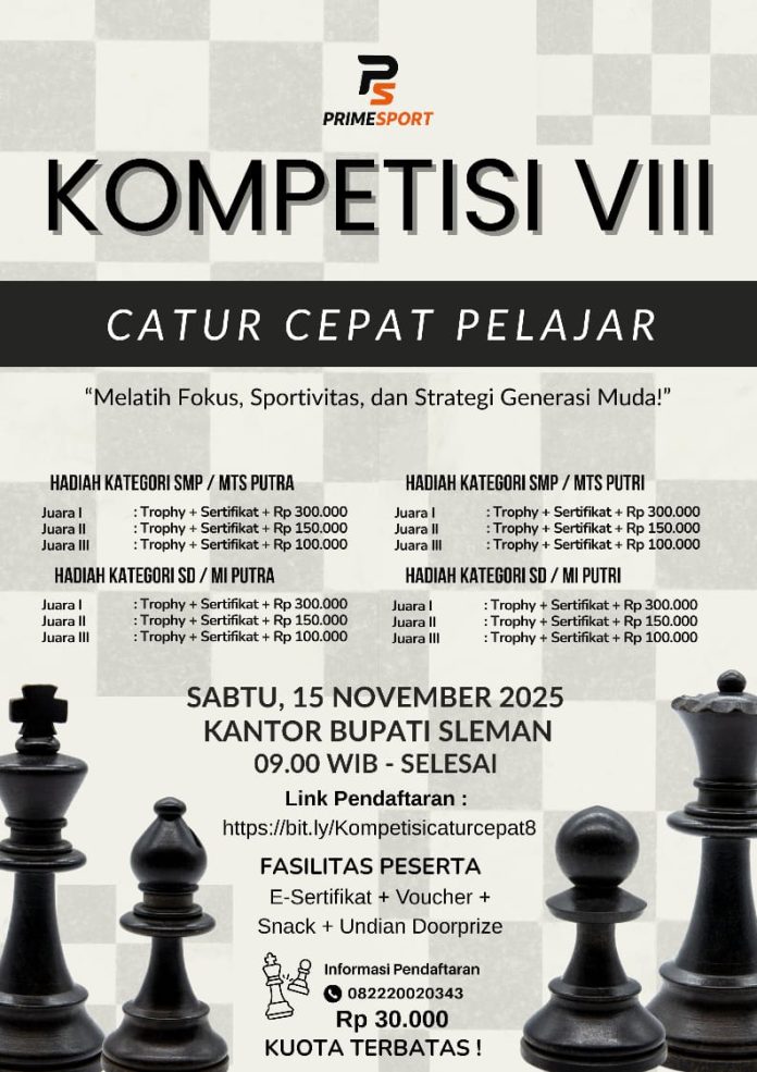 Pengumuman Ayo Ikuti dan Daftarkan Diri Anda pada Event Pertandingan Percasi Kabupaten Sleman (Kompetisi VIII Catur Cepat Pelajar) Penulis dispora - 4 November 2025 0 305