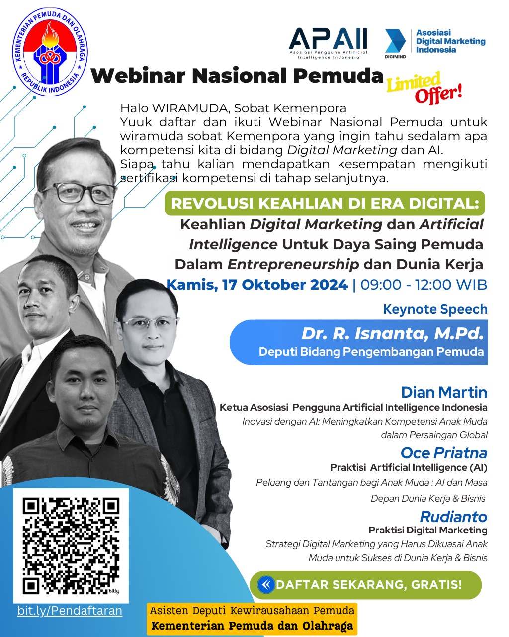 Halo WIRAMUDA, Sobat Kemenpora Deputi Bidang Pengembangan Pemuda mengadakan Webinar Nasional Pemuda untuk peningkatan keahlian Digital Marketing dan Artificial Intelligence...