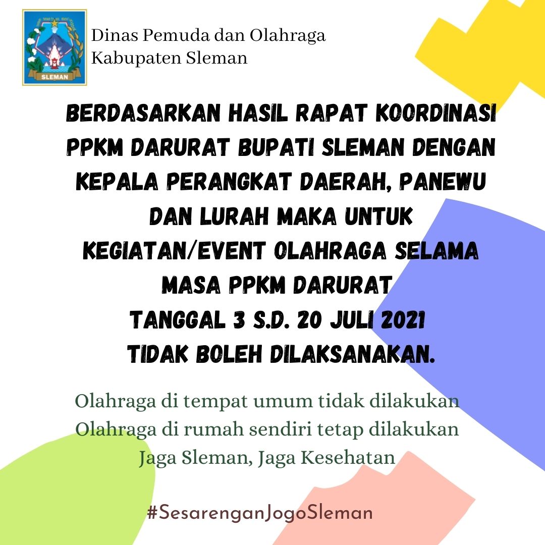 Berdasarkan hasil Rapat Koordinasi PPKM Darurat BUPATI SLEMAN dengan Kepala Perangkat Daerah, Panewu dan Lurah maka untuk kegiatan/event olahraga selama...